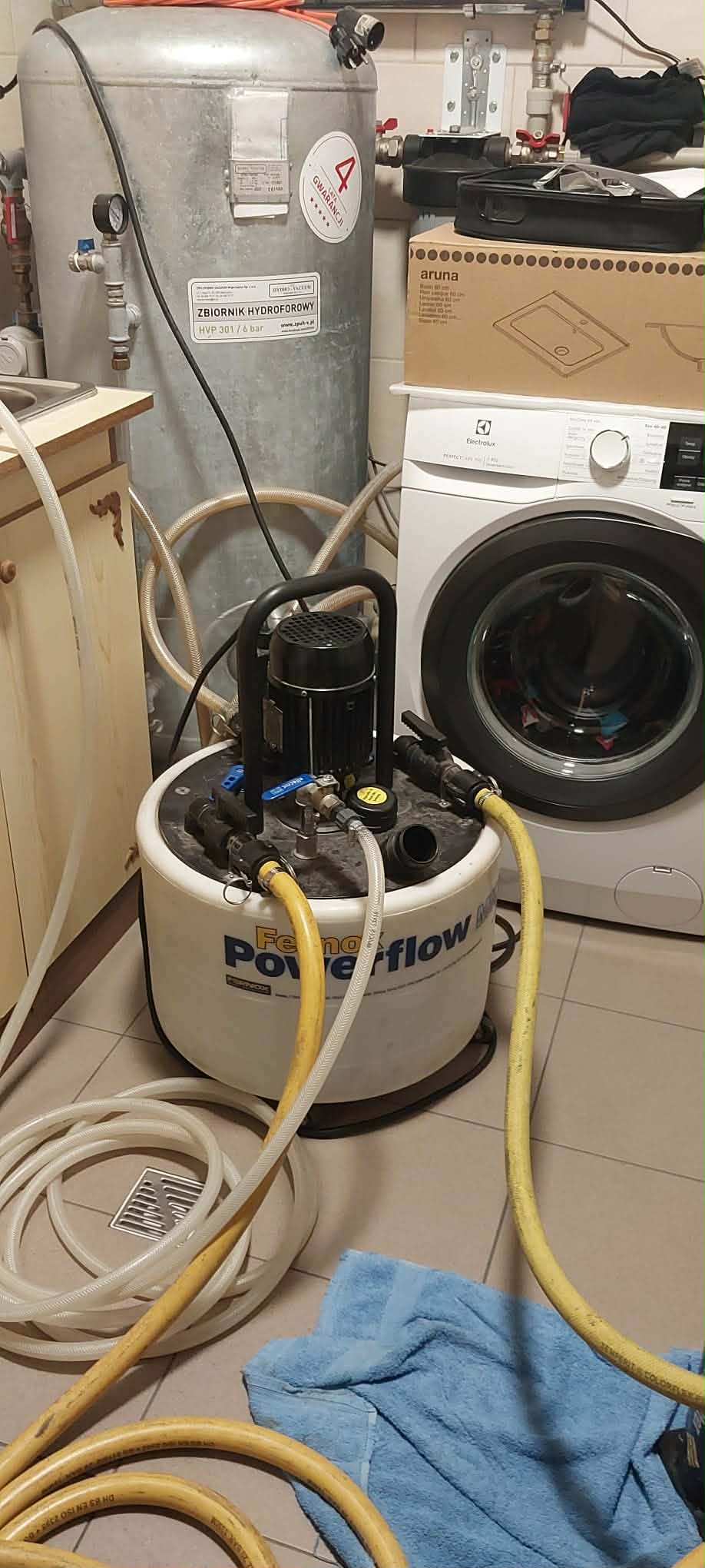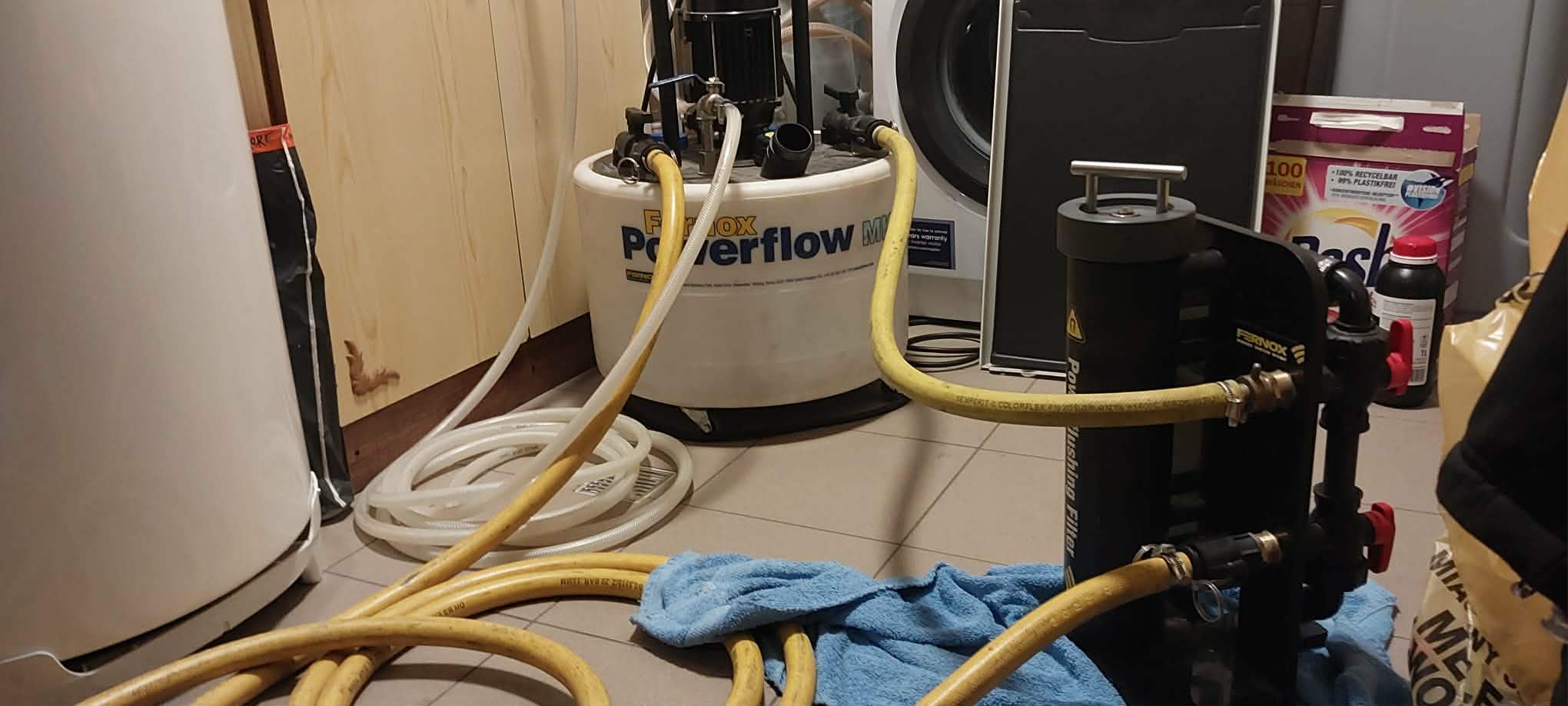 Podczas prac wykorzystano pompę czyszczącą Fernox Powerflow, która umożliwia dynamiczne płukanie instalacji przy użyciu specjalistycznych środków chemicznych.