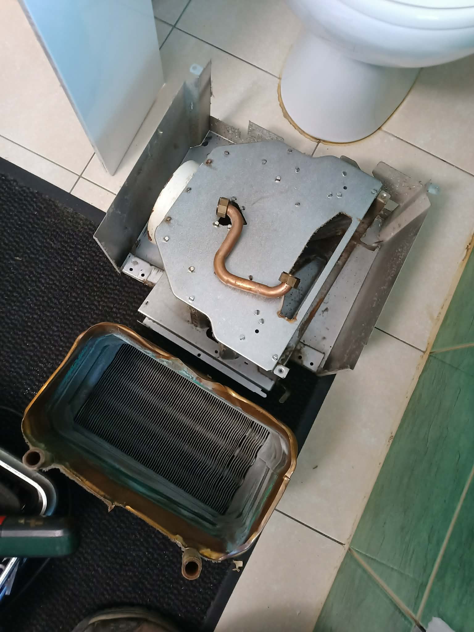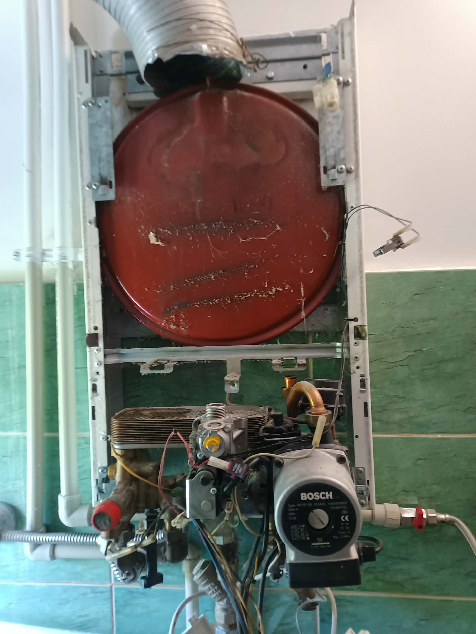 Wykonaliśmy serwis starszego kotła gazowego marki Bosch. Urządzenie wymagało dokładnego czyszczenia wymiennika ciepła oraz kontroli elementów spalania. Podczas przeglądu zdemontowano wymiennik oraz zespół spalania w celu usunięcia nagromadzonych osadów i zanieczyszczeń, które obniżały sprawność kotła.